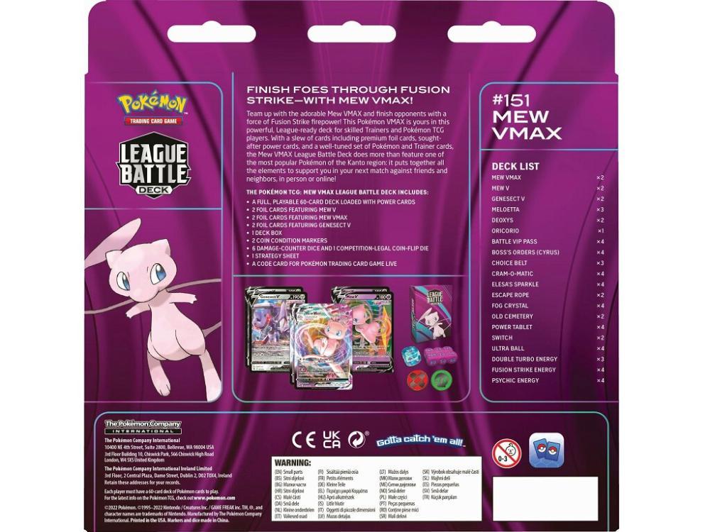 INCLUDES : A full, playable 60-card deck loaded with power cards, 2 foil cards featuring Mew V, 2 foil cards featuring , Mew VMAX, 2 foil cards featuring Genesect V, 1 deck box.2 coin condition markers.6 damage-counter dice and 1 compeion-legal coin-flip die.1 strategy sheet.A code card usable in either the Pokémon TCG Online or Pokémon TCG Live